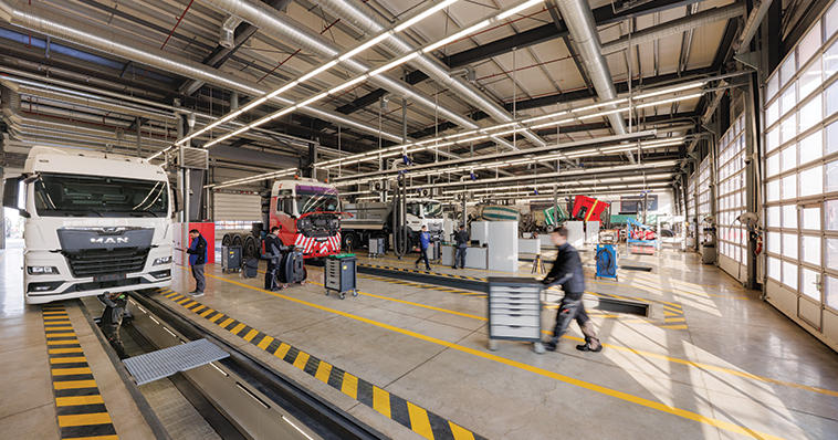 The four-hectare service center complex consists of four separate blocks, each dedicated to a different function. All areas are unified by a common concept: providing customers with an all-encompassing service experience utilizing state-of-the-art equipment, whether for chassis inspection, engine diagnostics, or electrical system analysis. Dedicated units are also available for paintwork repair, bodywork, and refrigeration systems.