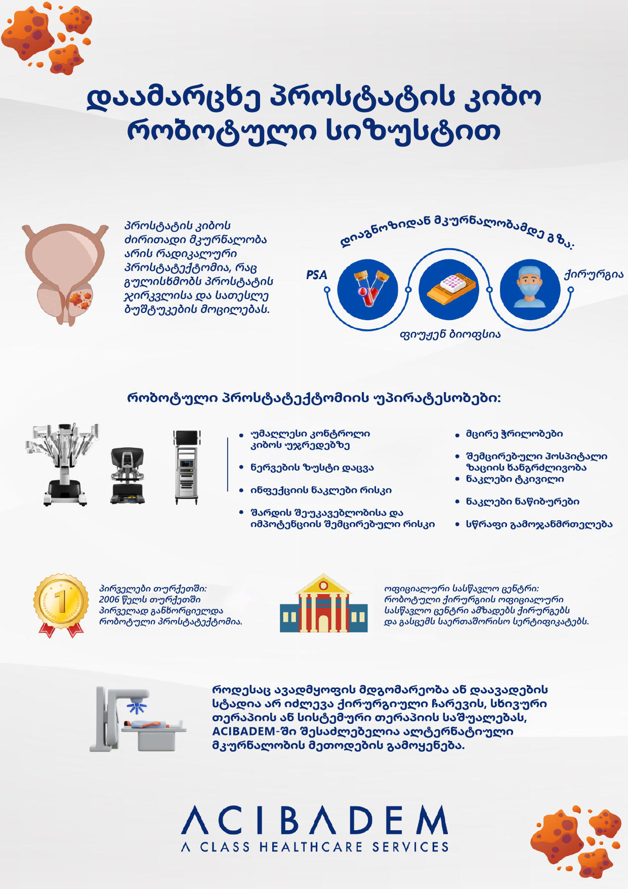 შესაბამისად, რობოტული ქირურგია წარმატებით დაინერგა Acıbadem Healthcare Group -ის 6 საავადმყოფოშიც. პროსტატას კიბოს მკურნალობაში რობოტული ქირურგიის გამოყენებაში გამოცდილი ჩვენი უროლოგების წყალობით ჩვენ უზრუნველვყოფთ სიმსივნის სრულად ამოკვეთას, შარდის შეუკავებლობისა და იმპოტენციის რისკის მინიმიზაციით. გარდა ამისა, Acıbadem-ის უნივერსიტეტში ფუნქციონირებს რობოტული ქირურგიის ოფიციალური სასწავლო ცენტრი, რომელიც ამზადებს ქირურგებს და გასცემს გლობალურად აღიარებულ სერტიფიკატს.