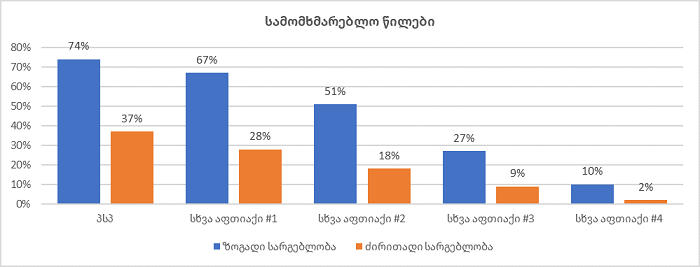 ლიდერის პოზიციას ადასტურებს სამომხმარებლო წილების განაწილებაც - PSP ლიდერია არა მხოლოდ ცნობადობის, არამედ სამომხმარებლო წილების მიხედვითაც. ჯამურად, მომხმარებელთა 74% ზოგადად სარგებლობს PSP-ს მომსახურებით, ხოლო 37% არჩევანს ძირითადად PSP-ზე აკეთებს.