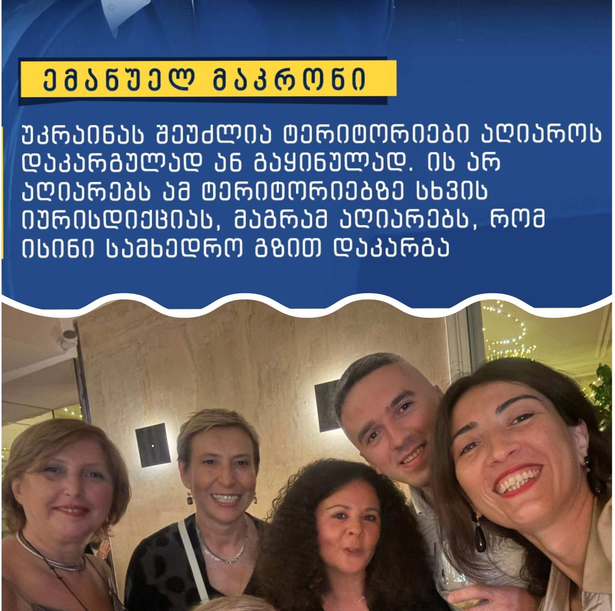 ქვემოთ კი საფრანგეთის ელჩის გაცილების საღამოა, სადაც, ელჩი, უცხოეთიდან დაფინანსებულ საქართველოს იმ მოქალაქეებთან ერთად პოზირებს, რომლებიც სამი წელია, უკრაინა-რუსეთის დაპირისპირებაში, საქართველოს ჩათრევას ცდილობენ.