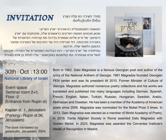 30 ოქტომბერს, იერუსალიმში, პოეტ დათო მაღრაძის წიგნის „ბარაქიანი მიწა“ პრეზენტაცია გაიმართება.