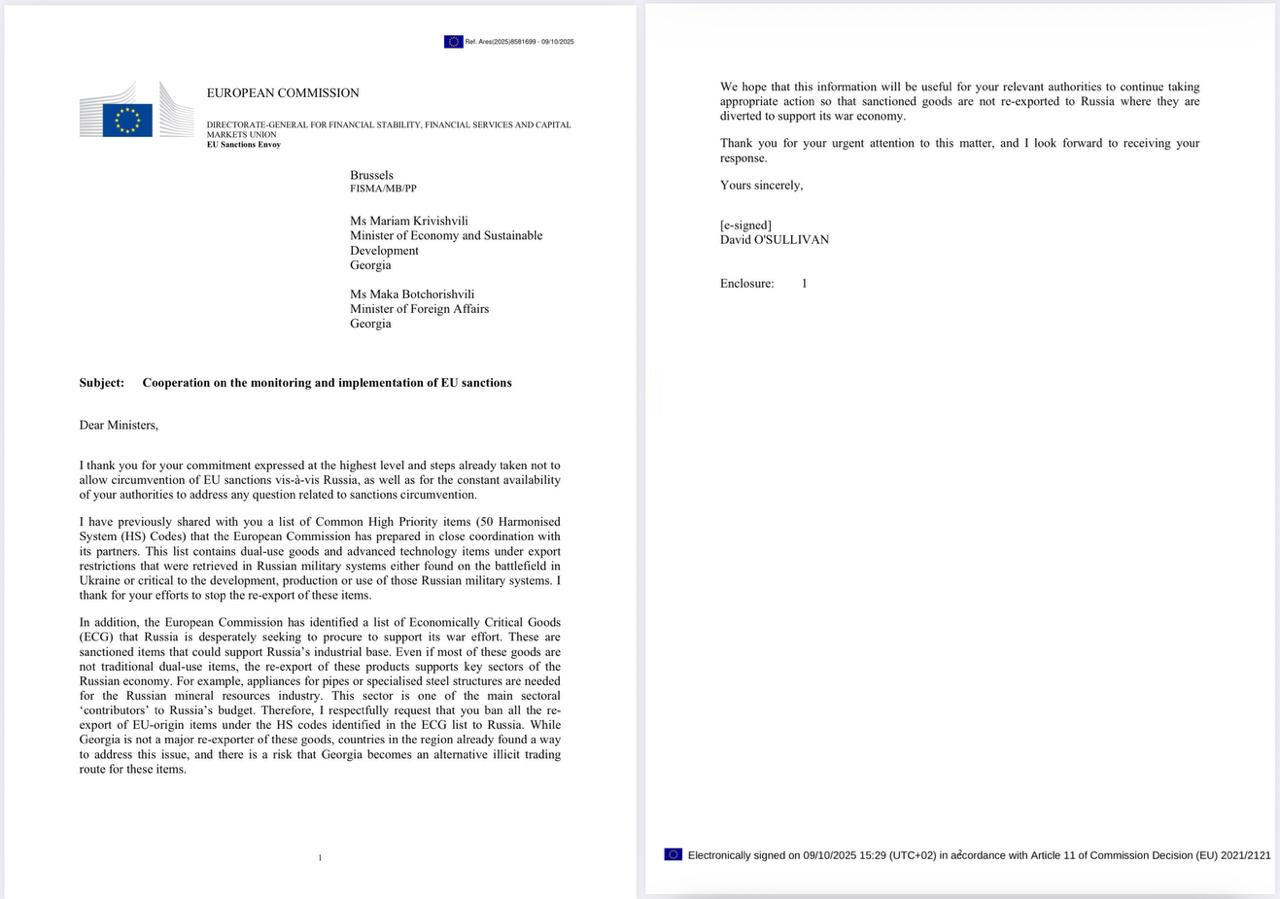 „მადლობას გიხდით უმაღლეს დონეზე გამოხატული ერთგულებისთვის და უკვე გადადგმული ნაბიჯებისთვის, რათა არ მოხდეს ევროკავშირის მიერ რუსეთის მიმართ დაწესებული სანქციების გვერდის ავლა. მადლობას გიხდით ასევე თქვენი ხელისუფლების მუდმივი ხელმისაწვდომობისთვის, რათა განხილულ იქნას სანქციების გვერდის ავლასთან დაკავშირებული ნებისმიერი საკითხი. მე ადრეც გაგიზიარეთ მაღალი პრიორიტეტულობის მქონე პუნქტების სია, რომელიც ევროკომისიამ შეადგინა პარტნიორებთან მჭიდრო თანამშრომლობის შედეგად. აღნიშნული ჩამონათვალი მოიცავს ორმაგი დანიშნულების საქონლისა და მოწინავე ტექნოლოგიების სიას ექსპორტის შეზღუდვების რეჟიმში მყოფ ნივთებზე, რომლებიც გამოვლენილია რუსეთის სამხედრო სისტემებში, ნაპოვნია ბრძოლის ველზე უკრაინაში ან კრიტიკული მნიშვნელობისაა რუსული სამხედრო სისტემების განვითარების, წარმოების ან გამოყენებისთვის. მადლობას გიხდით ამ ნივთების რეექსპორტის შეჩერებაზე გაწეული ძალისხმევისთვის. ევროკომისიამ შეადგინა ეკონომიკურ კონტექსტში კრიტიკული მნიშვნელობის მქონე საქონლის სია, რომლის შეძენასაც რუსეთი სასოწარკვეთილად ცდილობს თავისი საომარი მოქმედებების უზრუნველსაყოფად. ეს სანქცირებული ნივთებია, რასაც რუსეთის სამრეწველო ბაზის მხარდაჭერა შეუძლია. მიუხედავად იმისა, რომ ამ საქონლის უმეტესობა არ არის ტრადიციული გაგებით ორმაგი დანიშნულების ნივთები, მათი რეექსპორტი აძლიერებს რუსეთის ეკონომიკის ძირითად სექტორებს. მაგალითად, მილსადენებისთვის განკუთვნილი მოწყობილობები ან სპეციალიზებული ფოლადის კონსტრუქციები საჭიროა რუსეთის მინერალური რესურსების ინდუსტრიისთვის. ეს სექტორი რუსეთის ბიუჯეტის ერთ-ერთი მთავარი დარგის საარსებო წყაროა. ამიტომ, თქვენდამი პატივისცემით, მოგმართავთ თხოვნით, რომ აკრძალოთ ევროკავშირის წარმოშობის ყველა ამ სიაში მითითებული ნივთისა და ამ კოდების მქონე პროდუქციის რეექსპორტი რუსეთში. მიუხედავად იმისა, რომ საქართველო არ არის ამ საქონლის ძირითადი რეექსპორტიორი, რეგიონის ქვეყნებმა უკვე იპოვეს გზა ამ საკითხის მოსაგვარებლად და არსებობს რისკი, რომ საქართველო ამ ნივთებით ალტერნატიულ უკანონო ვაჭრობის გზად იქცეს. ვიმედოვნებთ, რომ ეს ინფორმაცია სასარგებლო იქნება თქვენი შესაბამისი ორგანოებისთვის, რათა გაგრძელდეს შესაბამისი ზომების მიღება და სანქცირებული საქონლის რეექსპორტი აღარ მოხდეს რუსეთში, სადაც მისი გადამისამართება ხდება სამხედრო ინდუსტრიის მხარდასაჭერად. გმადლობთ ამ საკითხისადმი თქვენი მყი