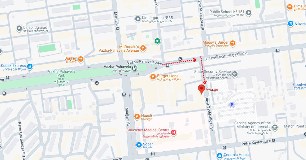 მნიშვნელოვანი განმარტება: გთხოვთ, გაითვალისწინოთ, რომ Avia.ge-ს ყველა ძველი ლოკაცია და ოფისი წყვეტს ფუნქციონირებას. ქვემოთ მითითებული მისამართი არის ჩვენი ერთადერთი ოფიციალური ოფისი ფიზიკური ვიზიტებისთვის.