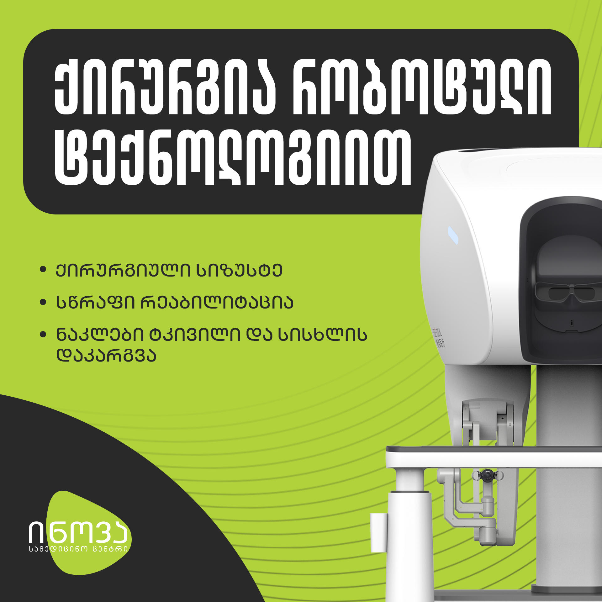 ინოვას ექიმების გამოცდილება და თანამედროვე ტექნოლოგია ერთიანდება იმისთვის, რომ პაციენტმა მიიღოს მაქსიმალურად უსაფრთხო, ზუსტი და ეფექტური ქირურგიული მკურნალობა.