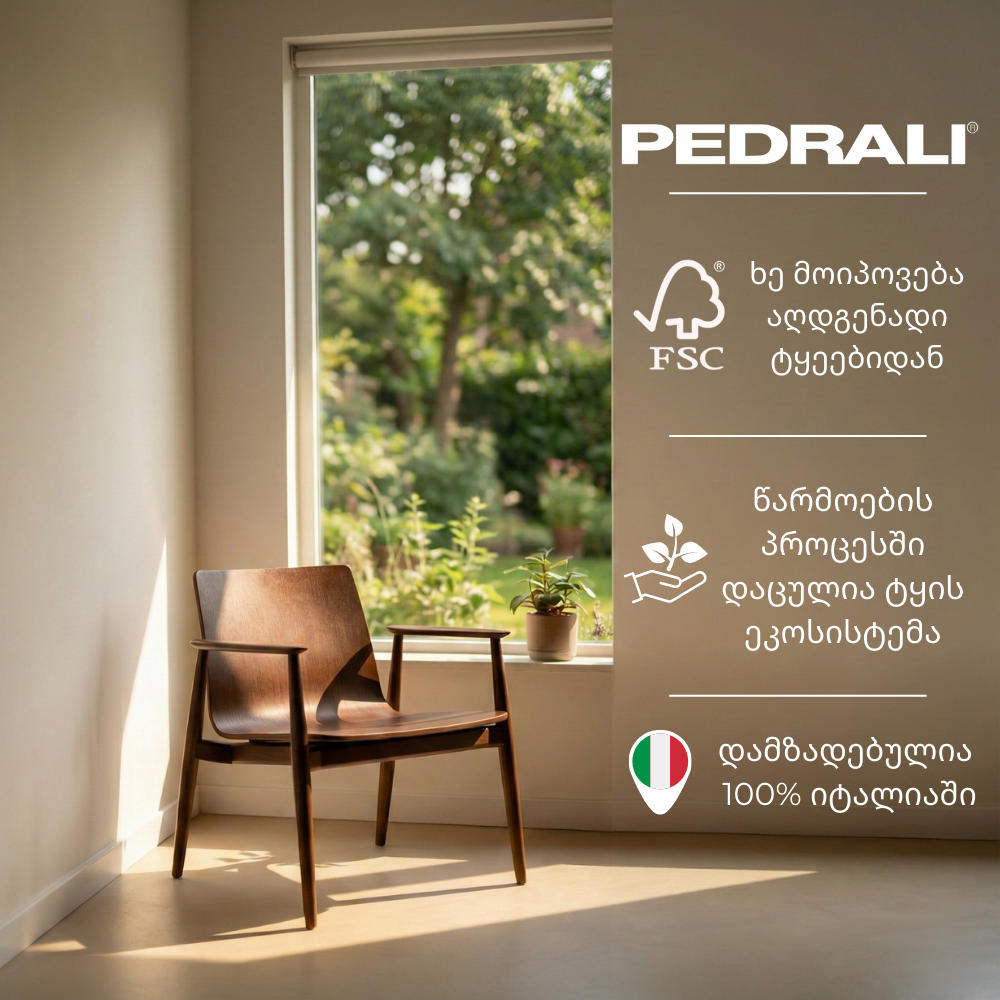 - Pedrali-ს ავეჯი გათვლილია კომერციულ დატვირთვაზე (რესტორნები, აეროპორტები). სახლის პირობებში მისი ცვეთა ნულოვანია.