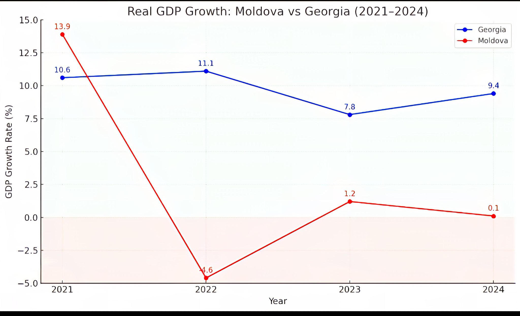 Председатель парламента Шалва Папуашвили публикует сравнение экономического роста Грузии и Молдовы в 2021–2024 годах и говорит, что с началом войны Молдова находится в глубокой экономической стагнации, в то время как Грузия – лидер по экономическому росту среди европейских стран.