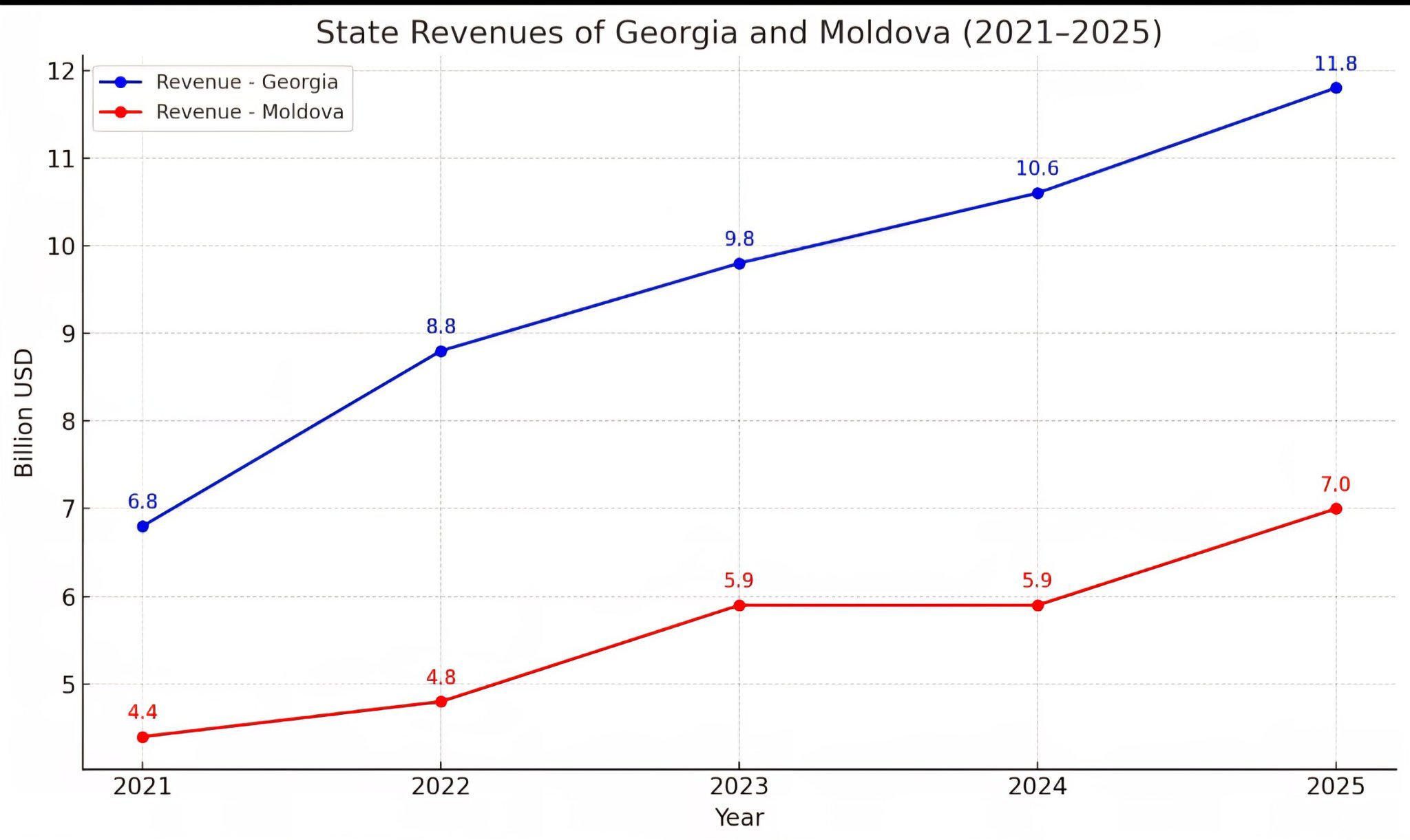 Когда в 2021 году бюджет Грузии был на 2,4 млрд долларов больше бюджета Молдовы, то в 2025 году наш бюджет превысит Молдовы на 4,8 млрд долларов, то есть за пять лет мы удвоили разницу между бюджетами.